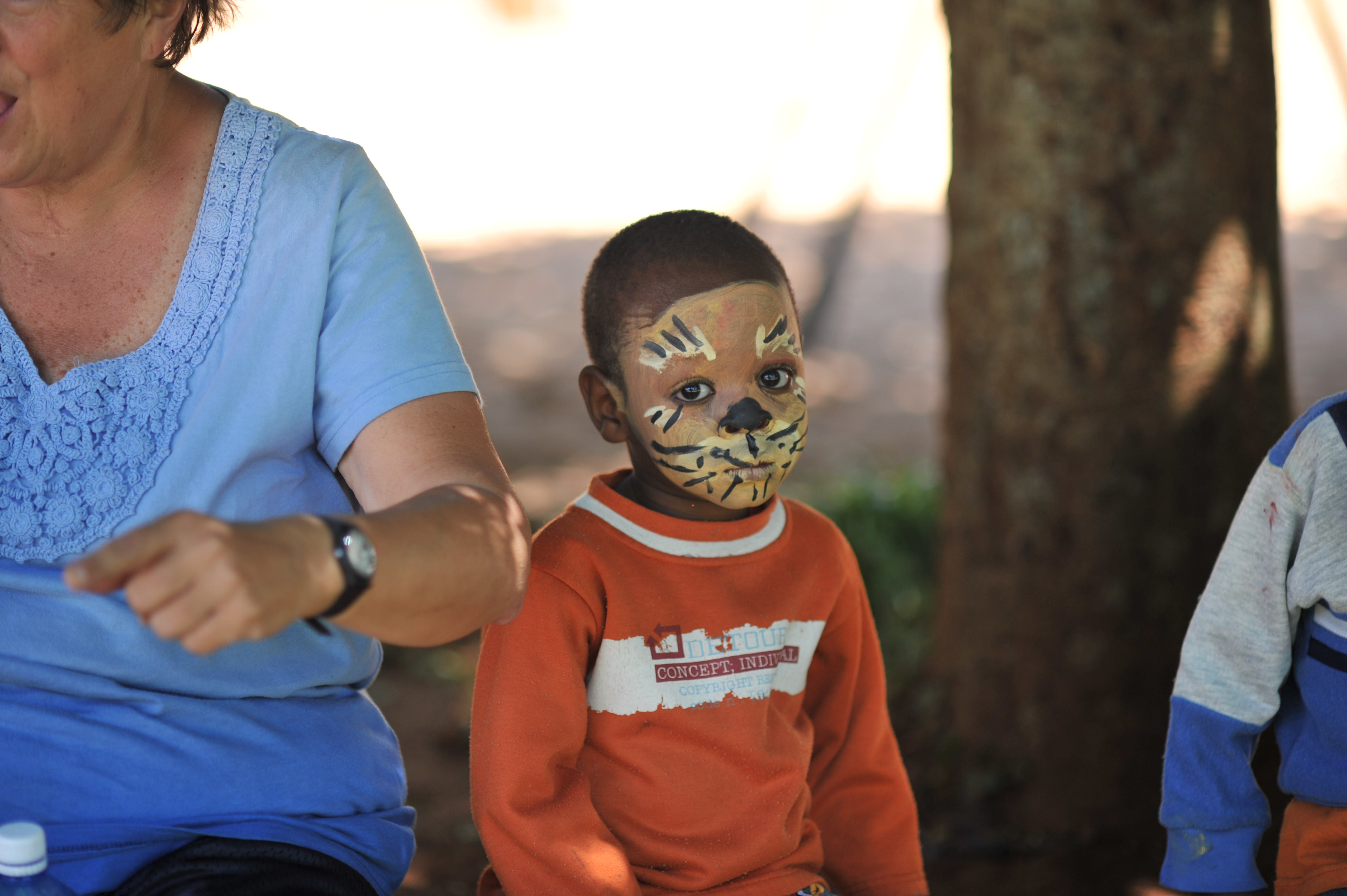 So we are here at last! We have thus far spent an exciting and  busy first day here at Nyumbani Children’s Home.  After trying to catch up a little after missing a whole day’s sleep we awoke to the generous hospitality of the our Spurwing hosts, neighbors to the children’s home, and the largest breakfast I have ever seen. The day then began with spending the morning with the preschool kids at the orphanage, the St. Paul Miki School kids. There were 4 adults and 2o children and we were very busy! Although all of these children are HIV+ they are healthy an energetic. While the other adults did a craft project and played on the played on the playground , I did facepainting with all 20 of them. It was a little like working with jumping beans in a bowling alley. They were all adorable and loved having their faces painted!