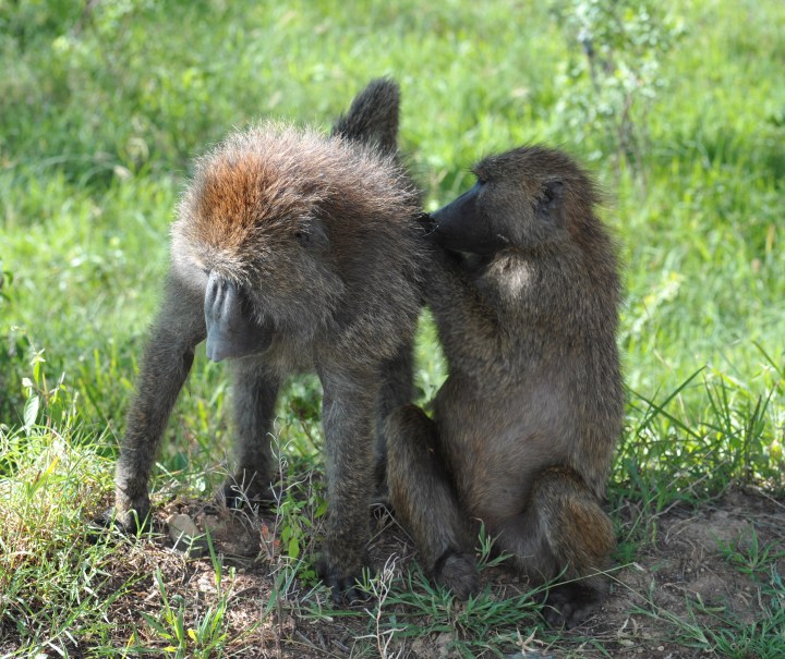 Adult baboons grooming each other