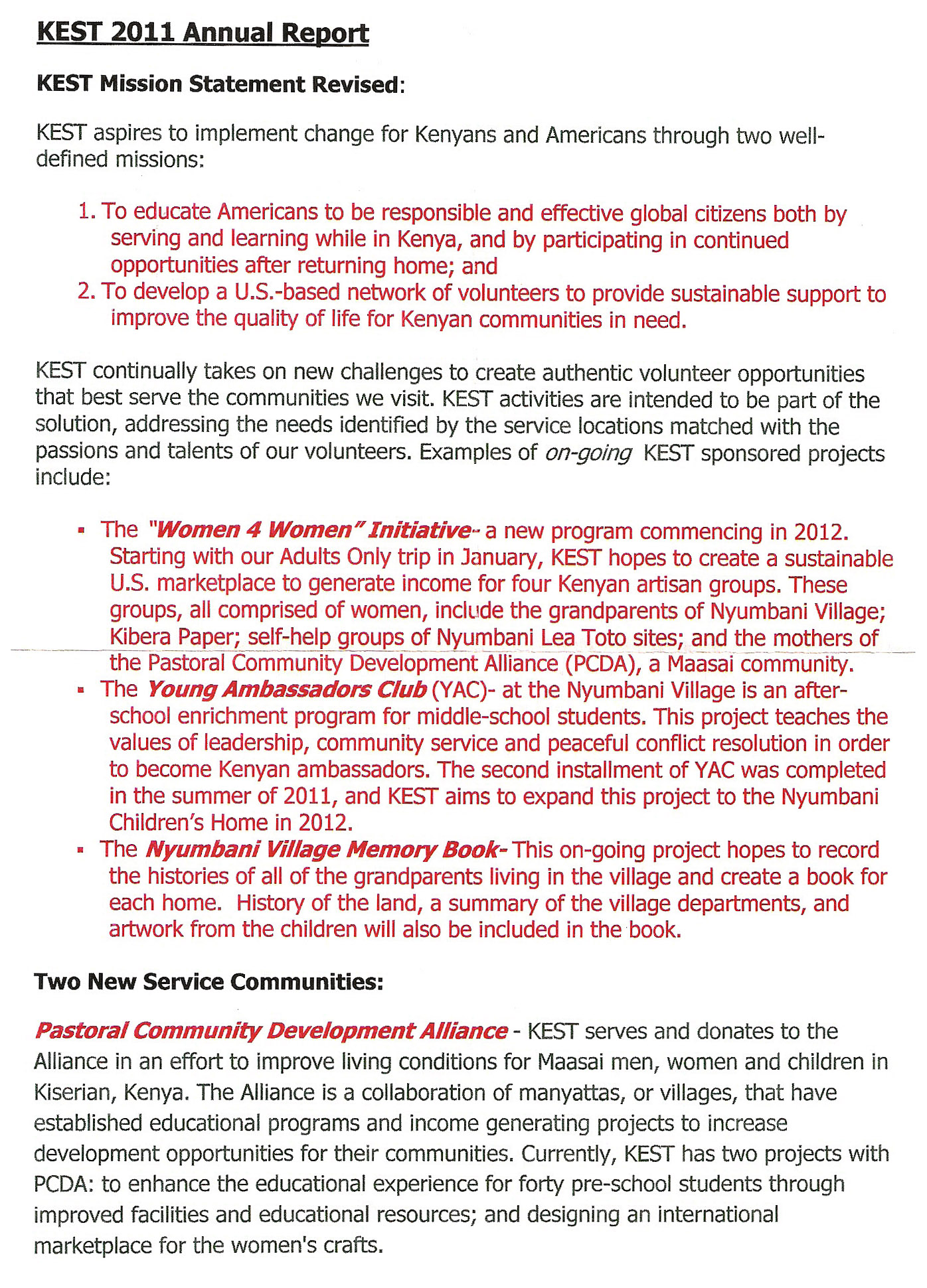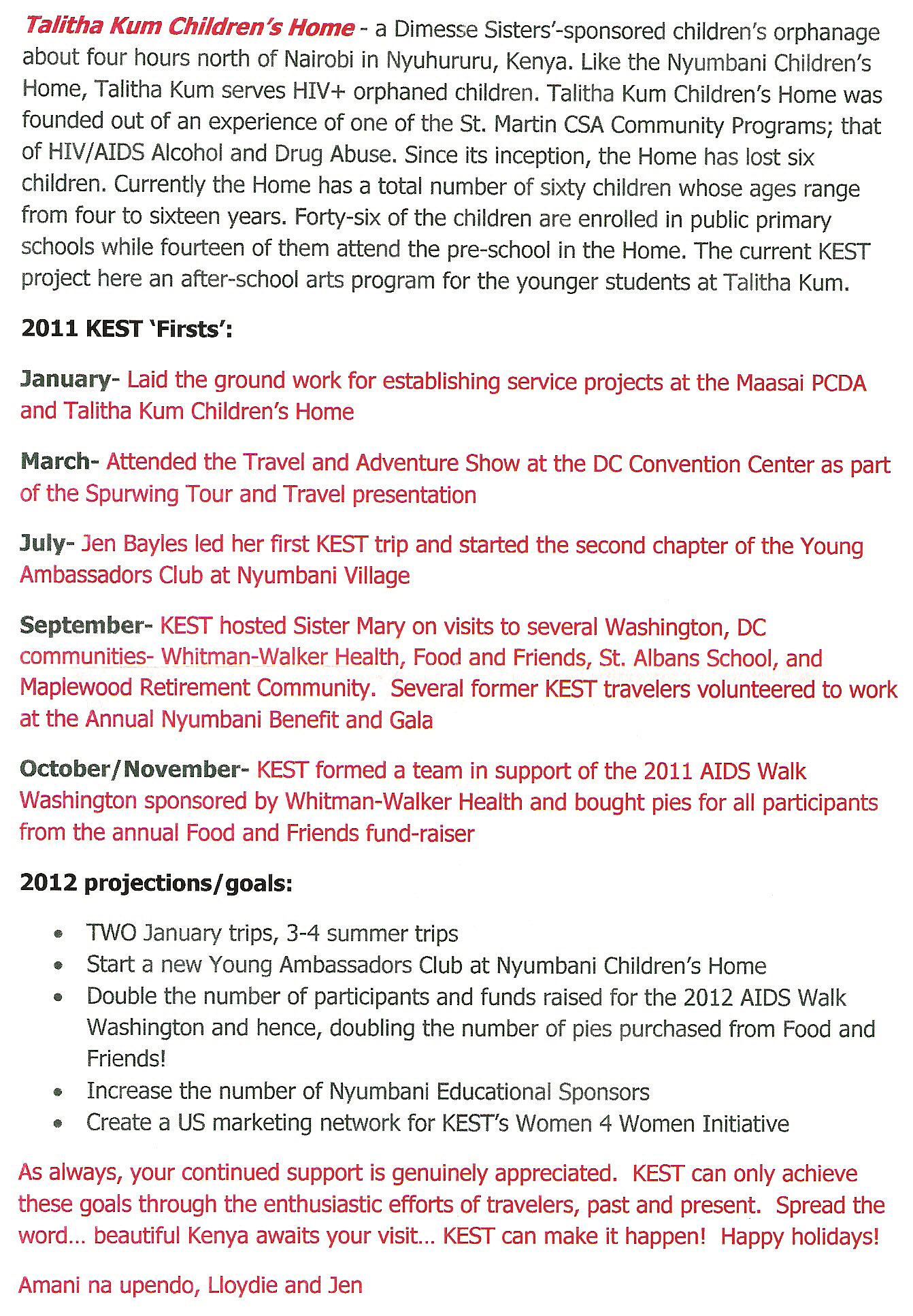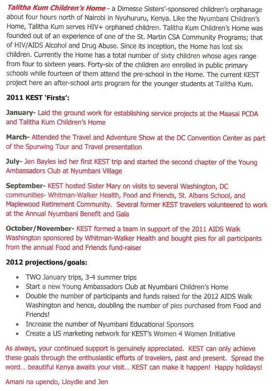 So this brings me to KEST, Kenya Educational and Service Trips (www.K-E-S-T.com). I can’t imagine going to Kenya in any other way than through KEST (and with you, Lloydie). KEST is a small operation started by one woman, Lloydie Zaiser, with a tremendous amount of enthusiasm, dedication, and love for the AIDS orphans of Kenya. It is still a tiny operation, yet I just received the annual report tucked in a holiday card (made by the women of Kibera paper of course) and have learned more about how KEST is expanding its mission beyond the Nyumbani Programs to two different sites, launching a number of new programs and increasing the number of volunteer trips to Kenya each year (I scanned the report so I could include it below in this post). This one little organization has done amazing things by bringing to Kenya so many volunteers and hundreds of duffels of donations and finding education sponsors for Nyumbani children and so much more….. I think this has a lot to do with the infectious enthusiasm and love of the mission that Lloydie brings to it as well as the incredible spirit of the Kenyan people that you get to soak up while you are there. But it also reflects the way that the totality of the experience profoundly binds you to each other and to the cause –what I referred to as the magical magnetism of shared volunteerism. Having been on one volunteer trip with KEST, you can’t just do one, you are now a KEST lifer! Your heart will call you back again to the children and the people and the country, to all of it. And if there are moments when you might not listening, you’ll get emails from Lloydie that will give you updates about the children that will pull at your heartstrings, or remind you of the touching moments in Kenya (or tease you about how it will be 8o degrees and sunny there in February when its snowy and cold in Maine.)
