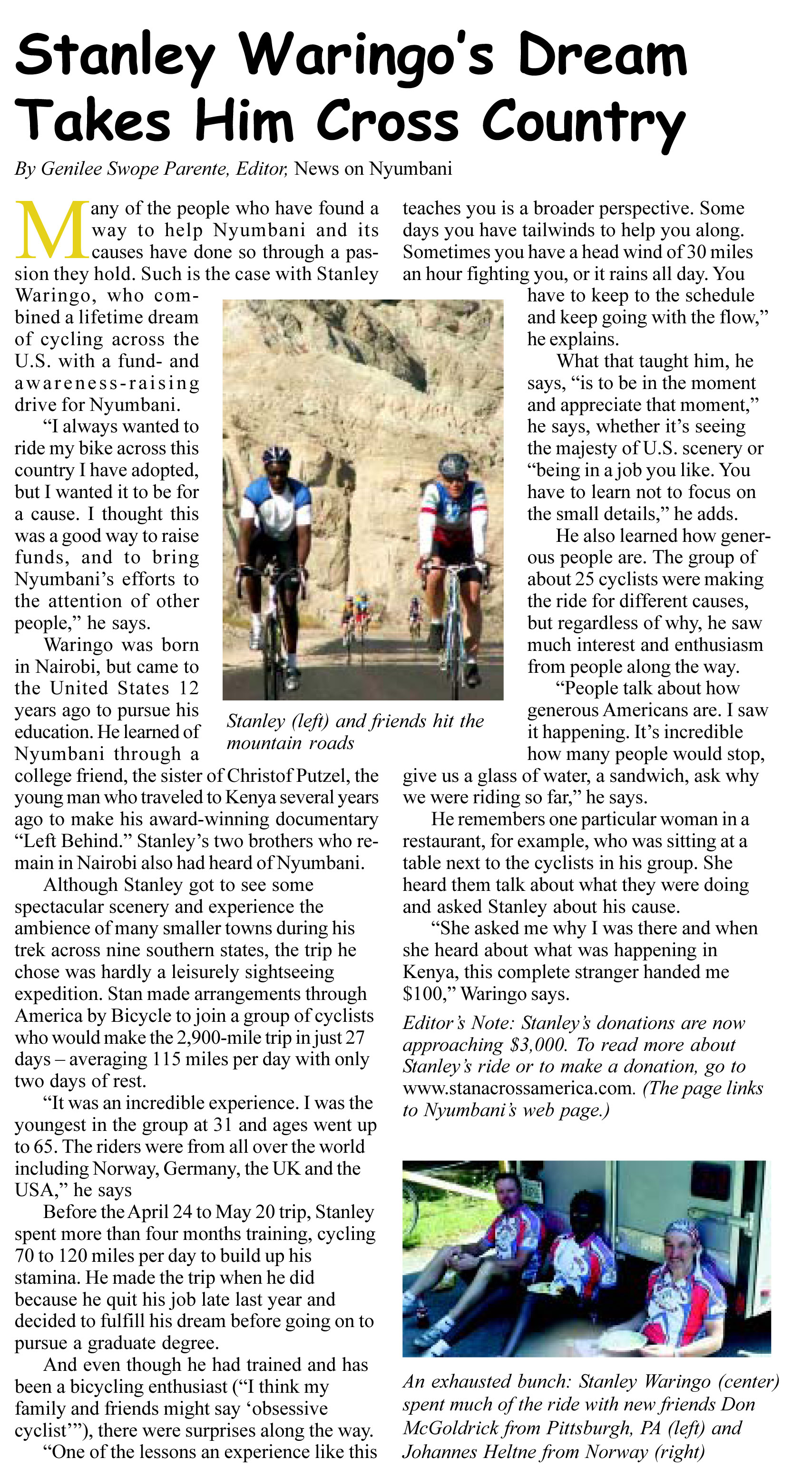 This is a question that I have been asked several times in the past week and in the course of answering it I have realized that I delight in telling the story, so I thought I would tell it here. As we live in the town where Bowdoin College is located and my husband, Tom, is an alumnus, we had a connection to the college when we first moved here. From very early on we began participating in the Host Family Program in which local families provide support and a local connection to Bowdoin College students who are international students and thus far away from home. We began being a host family when our sons, now about to turn 21, were still babies. It was a wonderful opportunity for our family to learn about other cultures and get exposed to some ethnic diversity which is very limited in Brunswick. We had particularly close relationships to the students whom we hosted for all 4 years and who we watched graduate along with their own parents who traveled across the world to do so. One such student was Stanley from Kenya. I don’t know if I ever told him this, but of our sons who was quite young at the time, but not very familiar with people from Africa or even African-Americans, when he was told that Stanley was coming for a visit, referred to him as “that really tall guy with curly black hair and the pink fingernails” –Stanley IS very tall. His mother and sister stayed with us at graduation time and we took them on their first ever trip to the beach and had a wonderful time getting to know them. We later visited Stanley when he was working at a job in Washington D.C. A number of years later we heard from him that he was doing a fund-raiser bicycle trek ACROSS the US to raise money for an AIDS Orphanage back in Kenya named Nyumbani and asking if we would like to be a sponsor. So it was through Stanley that we learned of Nyumbani.