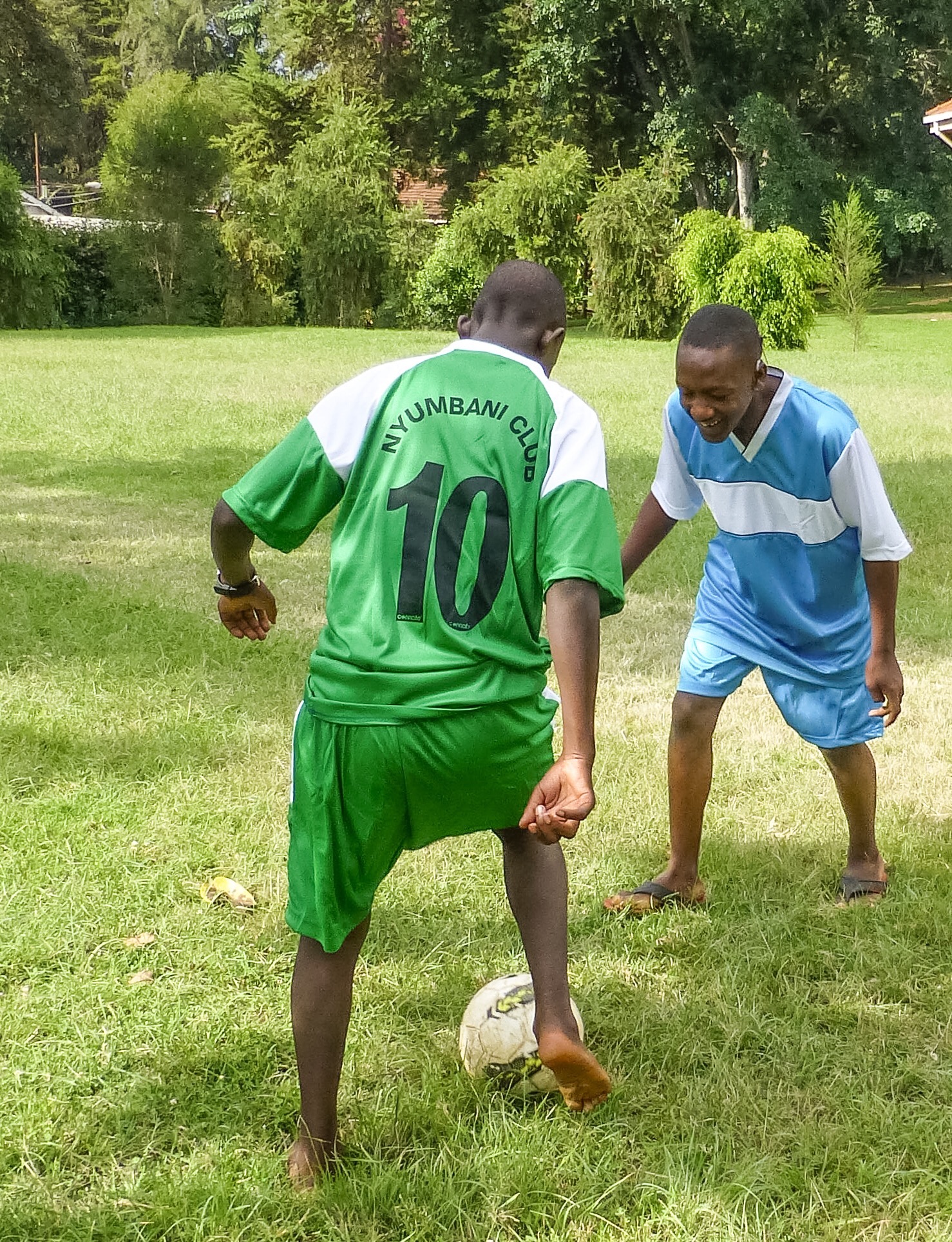 Mungai and Reagan modeling the new team sports jersys for the village football, volleyball and basketball teams.